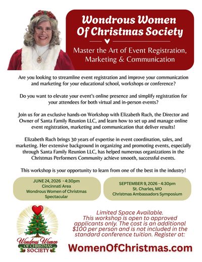 Join us for an exclusive hands-on Workshop with Elizabeth Ruch, the Director and Owner of Santa Family Reunion LLC, and learn how to set up and manage online event registration, marketing and communication that deliver results!